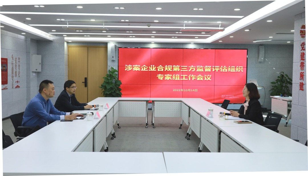 2022年10月14日,淮安市某涉案企业合规第三方监督评估组织专家组工作会议在北京盈科(淮安)律师事务所(以下简称“盈科淮安律所”)召开。涉案企业合规第三方组织专业人员淮安市工商联经济联络处副处长朱翔、淮安市市场监督管理局法规处处长孙人清、盈科淮安律所监事会主任滕庆红律师参加会议。